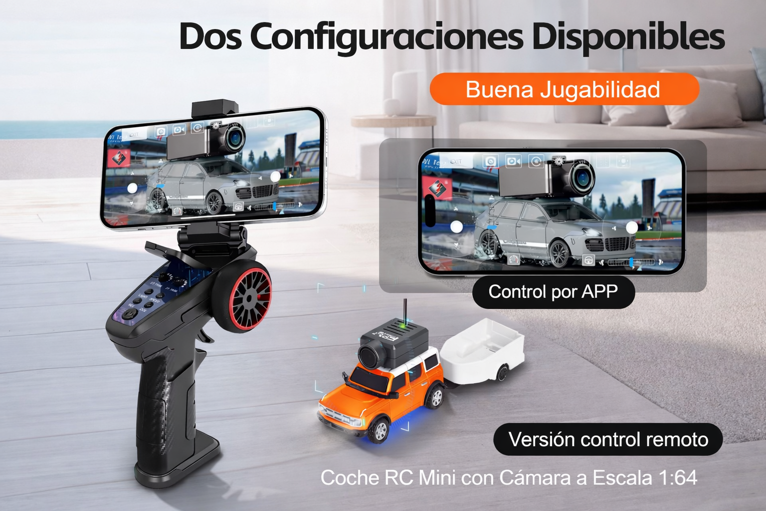 Puedes pilotar el coche directamente desde tu smartphone usando la aplicación oficial, que se descarga fácilmente escaneando el código QR incluido en el producto. Además, de manera opcional, puedes añadir el kit TurboCam RC, que trae un mando RC tradicional, un estuche de transporte y remolques acoplables, para disfrutar también del control clásico y una experiencia más completa.